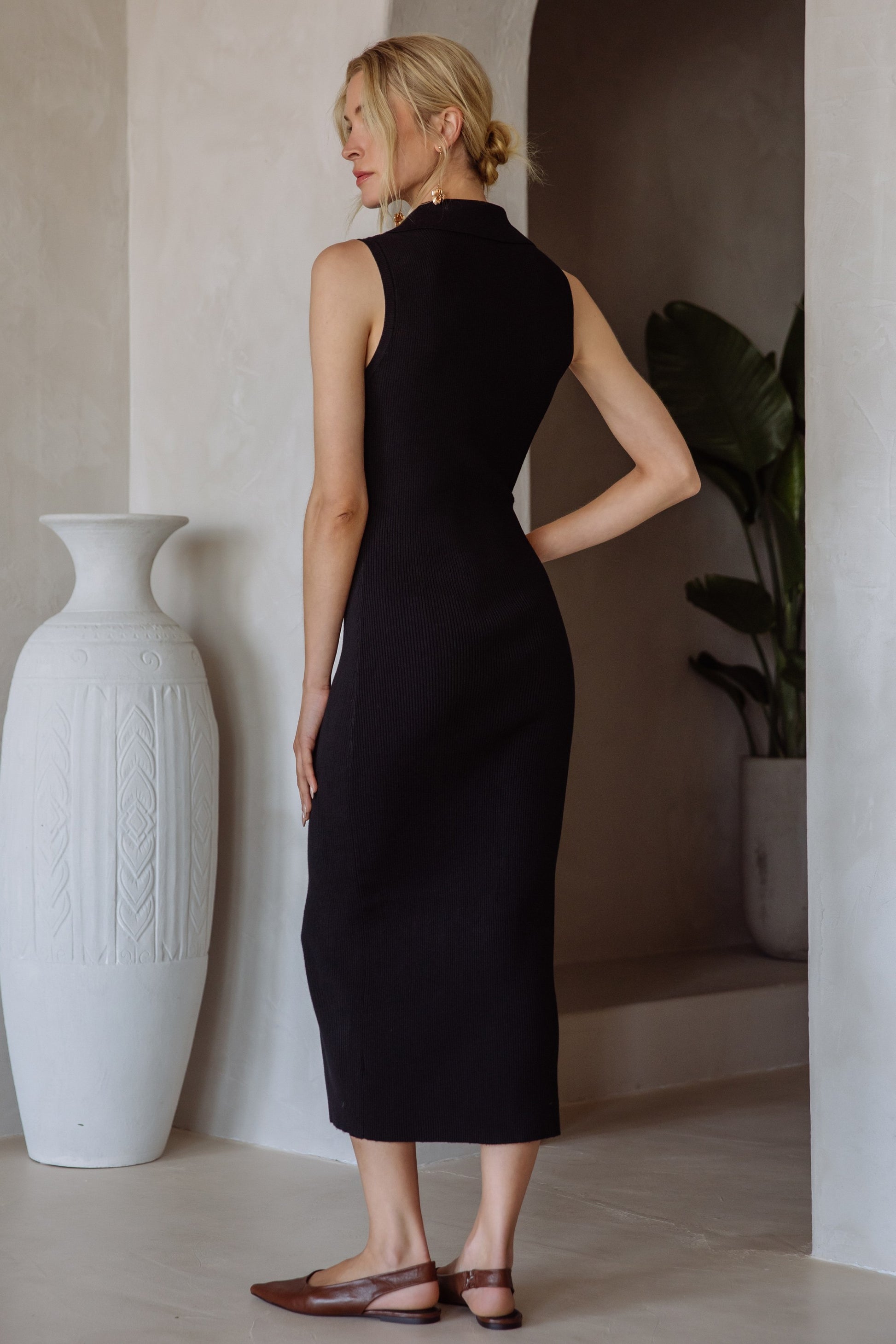 Elevate your wardrobe with this sleeveless midi dress featuring elegant gold twist lock buttons. Its refined silhouette and subtle detailing create a timeless look, perfect for sophisticated occasions where understated luxury is key.