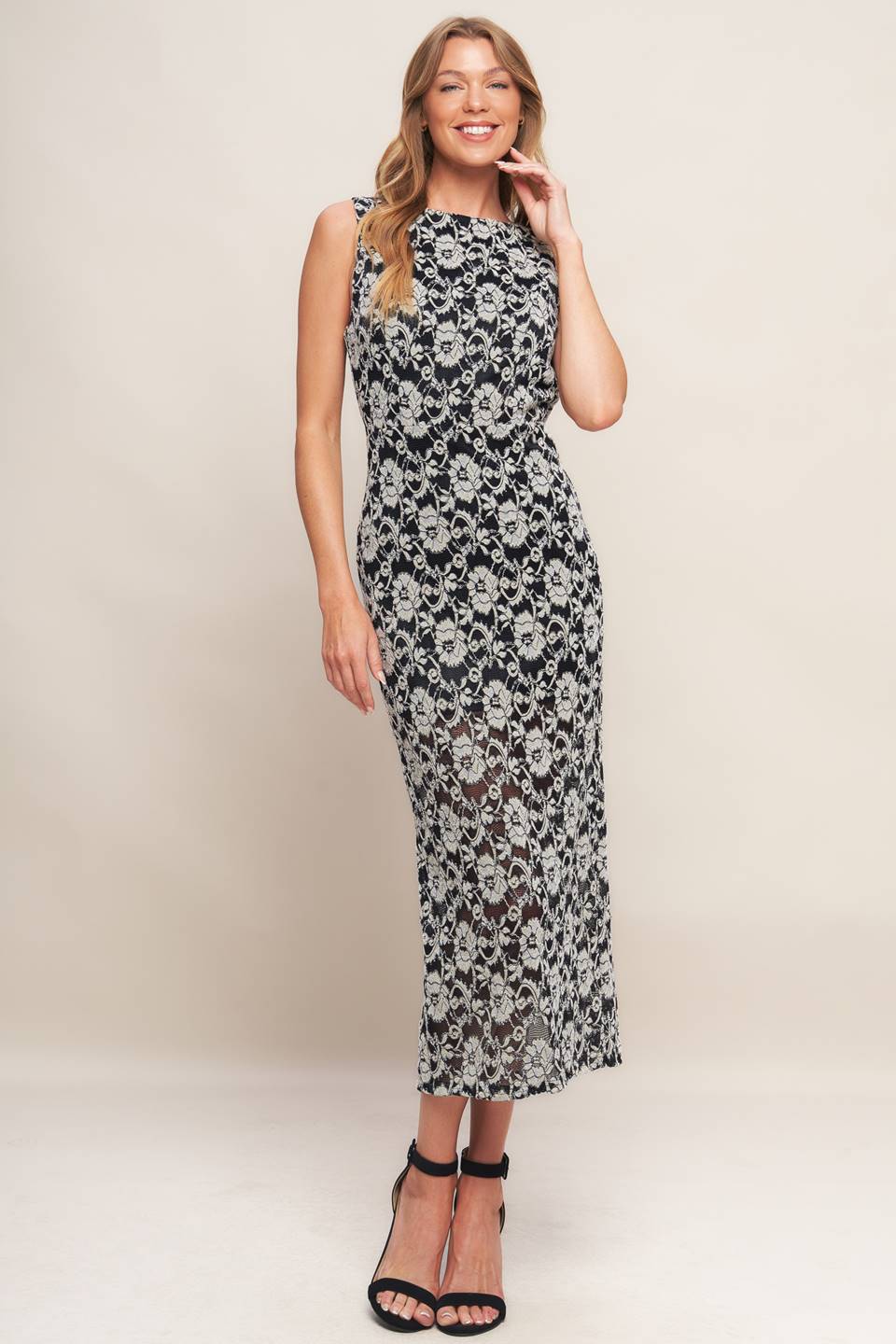 Embrace bold elegance with this stretch lace midi dress designed to contour your body flawlessly. Featuring a wide neckline and sleeveless cut, it effortlessly highlights your silhouette while the open back adds a seductive edge. Perfect for making a daring statement at any occasion.