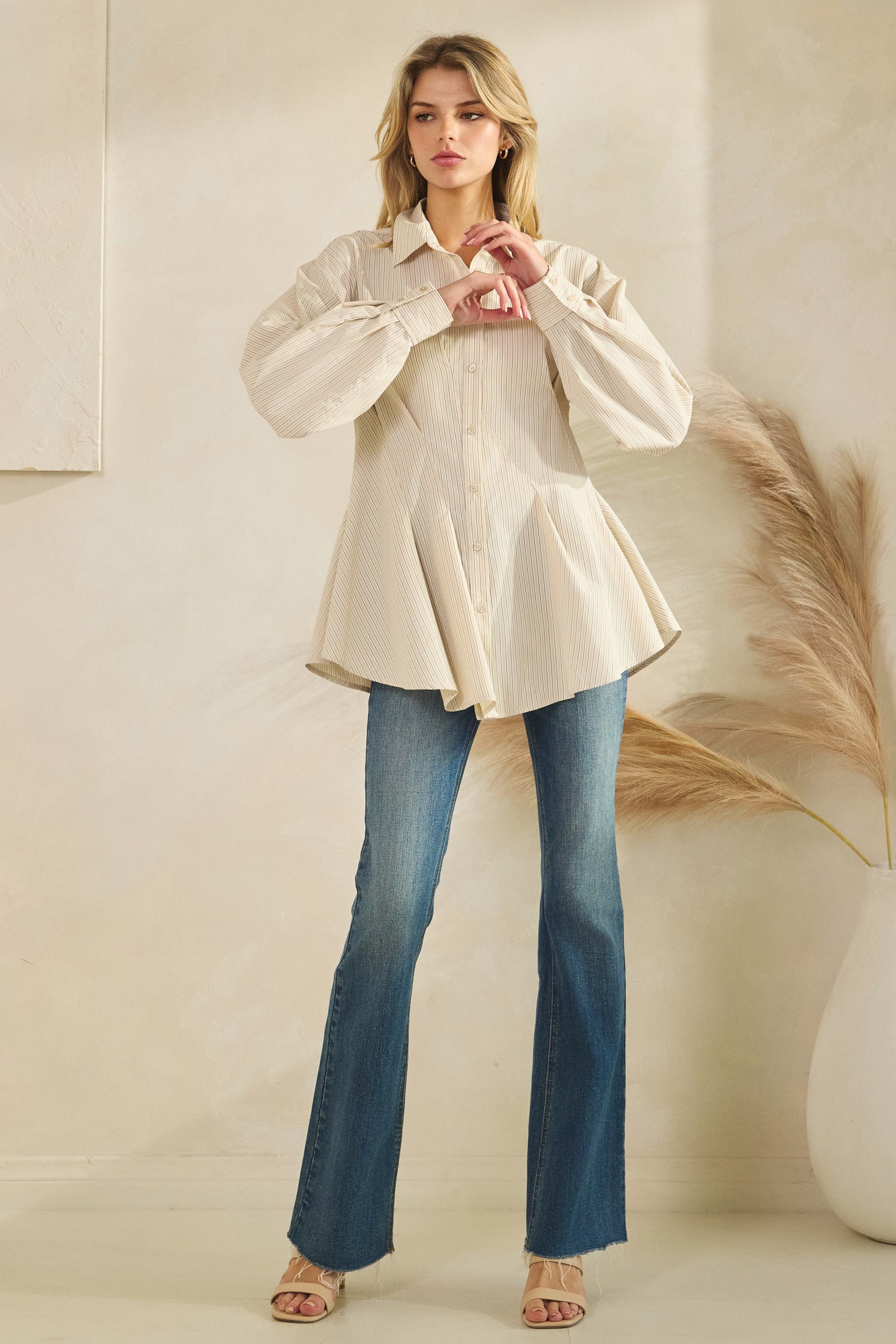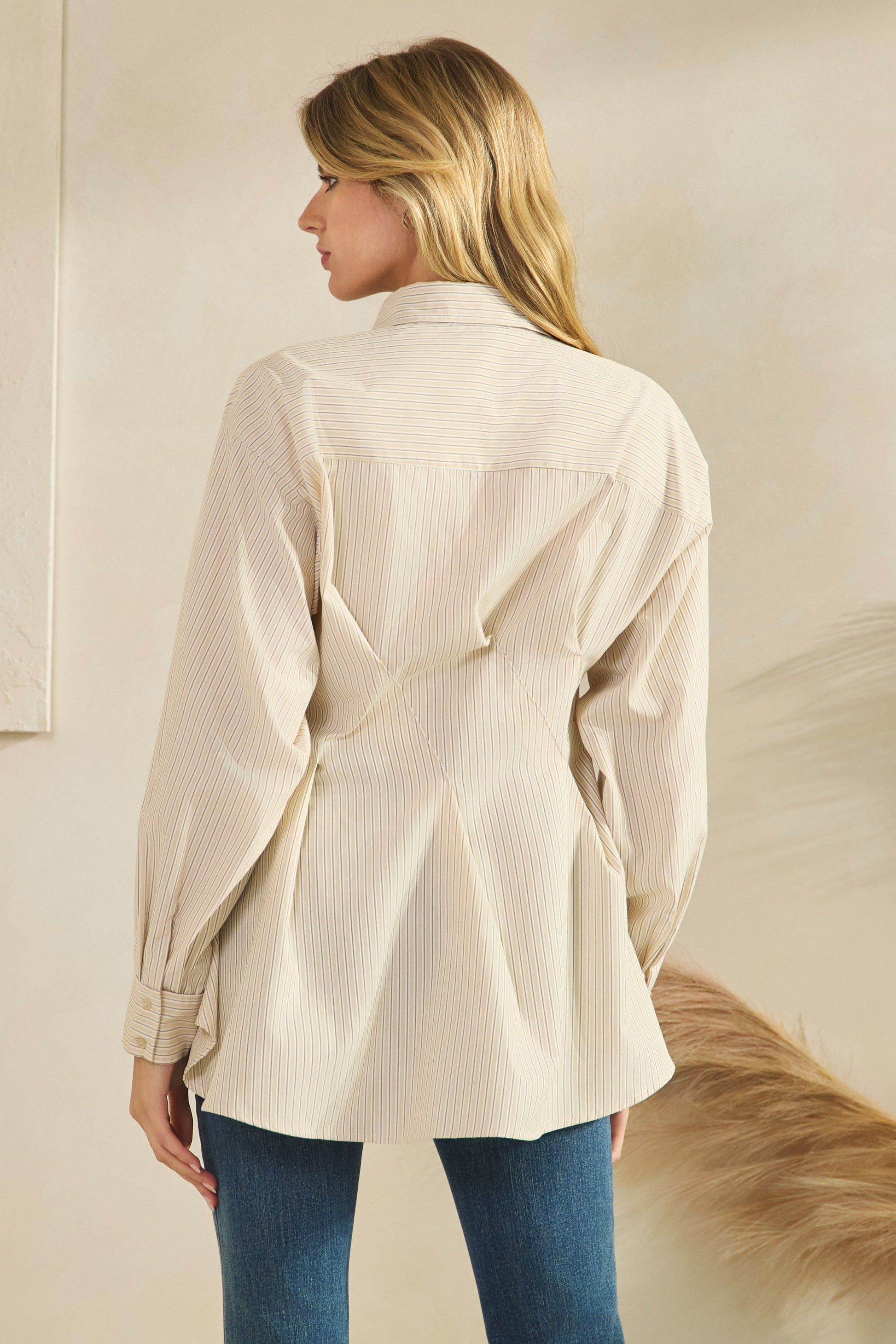 Elevate your wardrobe with this refined striped top, featuring a distinctive cross-pleated waist that creates an instantly flattering silhouette. The classic stripe pattern pairs effortlessly with your everyday essentials, while the architectural pleating at the waist adds a touch of contemporary elegance. Perfect for transitioning from office to evening, this versatile piece delivers polished sophistication with every wear.